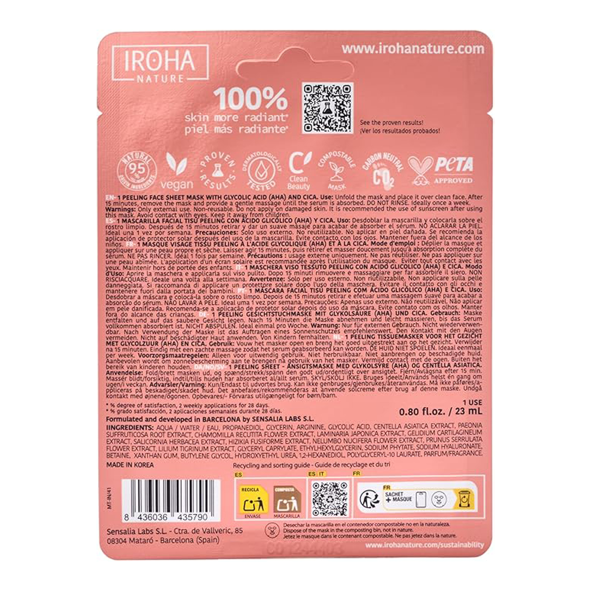 Mascarilla facial exfoliante enriquecida con Ácido Glicólico que aporta una exfoliación suave a la piel eliminando las células muertas, restos de maquillaje e impurezas de las capas más externas de la superficie cutánea dando como resultado una piel de aspecto más luminoso, joven y saludable. Además, esta mascarilla tisú contiene centella asiática, conocida por sus propiedades calmantes y regenerativas, dejando la piel más suave y luminosa. Por último, el ácido hialurónico se encarga de aportar una hidratación y suavidad instantánea.